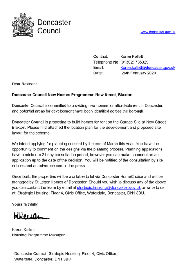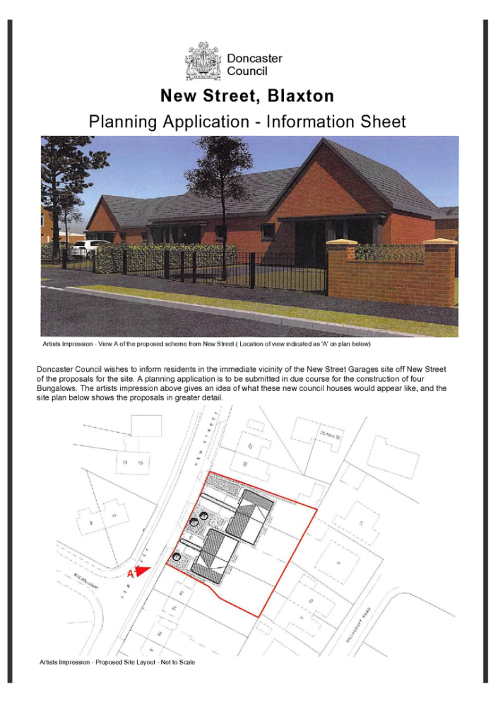 The Parish Council will consider the proposal by DMBC to build four bungalows on the current garages site on New Street at the Council meeting to be held on 19 March 2020.